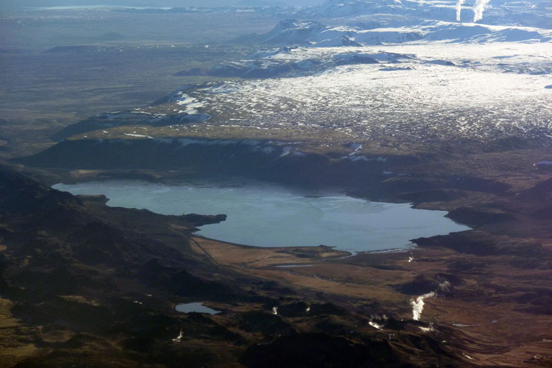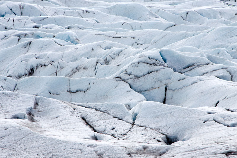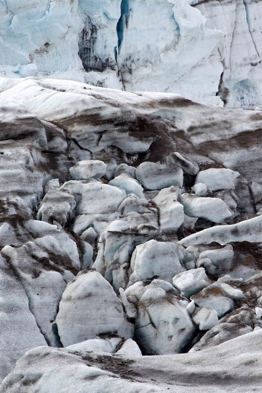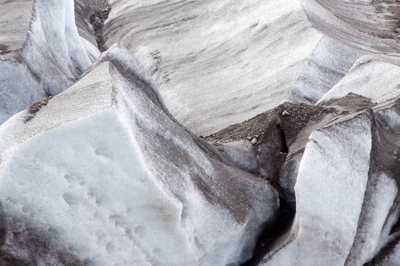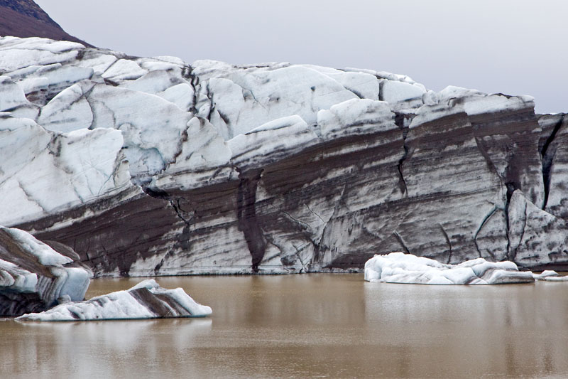 Ich bewege mich also vorsichtig und mit etwas Abstand an der Kante vorbei und schaue hinunter auf den Gletscher, an dem sich ebenfalls eine kleine Lagune gebildet hat. Das Eis ist von Ascheschichten durchzogen, wahrscheinlich hat dazu auch der Eyjafjallajökull einen großen Teil beigetragen.