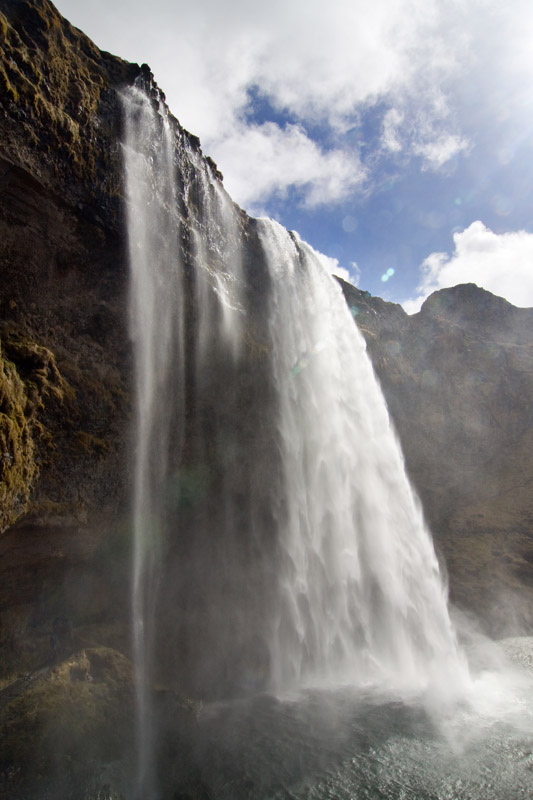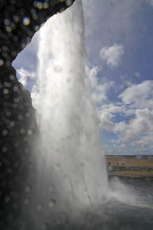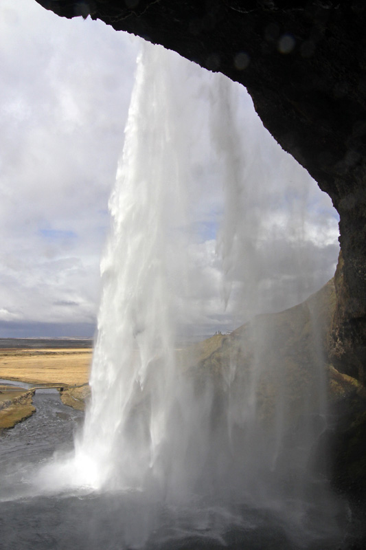 Ich kann mich kaum von den hübschen Isis trennen, aber ich kann mich ja auch nicht den Rest des Tages auf dieser Weide herumdrücken. Also geht die Fahrt weiter. Als ich schließlich den Seljalandsfoss erreiche, ist die Sonne gerade um den Wasserfall „herumgekommen“. Netterweise kämpft sie sich ab und zu zwischen dicken Wolken hindurch, während ich den Wasserfall umrunde. Man kann nämlich hinter dem Seljalandsfoss vorbeigehen, allerdings wird die Regen- und Fotoausrüstung dabei auf eine harte Probe gestellt: