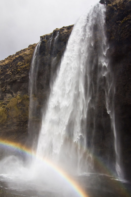 Während ich am Foss bin, stoppen Massen von kleinen und großen Tourbussen, spucken Menschen aus, saugen sie wieder auf und fahren weiter. So ein Betrieb, dabei hat die Urlaubssaison in Island eigentlich noch gar nicht richtig angefangen. Ich bin nicht zum ersten mal froh, dass ich mit dem Mietauto unterwegs bin und mir einfach die Zeit nehmen kann, die ich will, statt überall nur für eine Viertelstunde aus dem Bus zu hüpfen. Als ich nochmal ein Stück um den Foss herumgehe, sehe ich plötzlich einen Regenbogen in der Gischt: