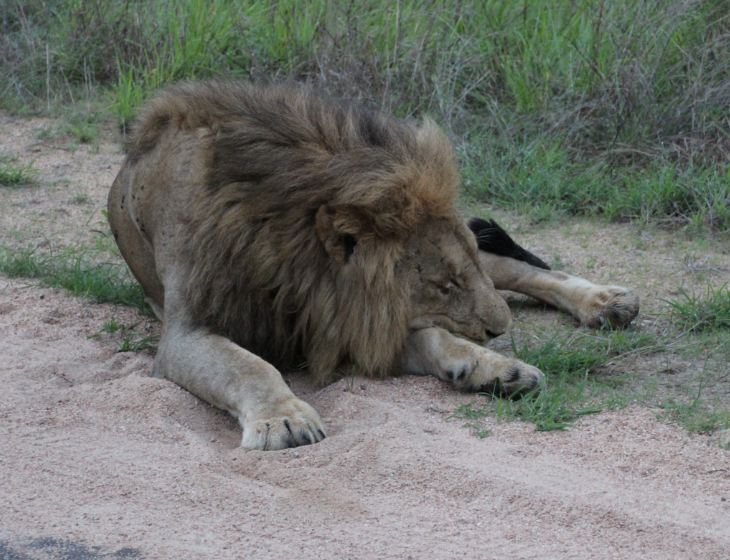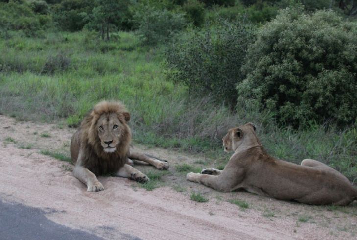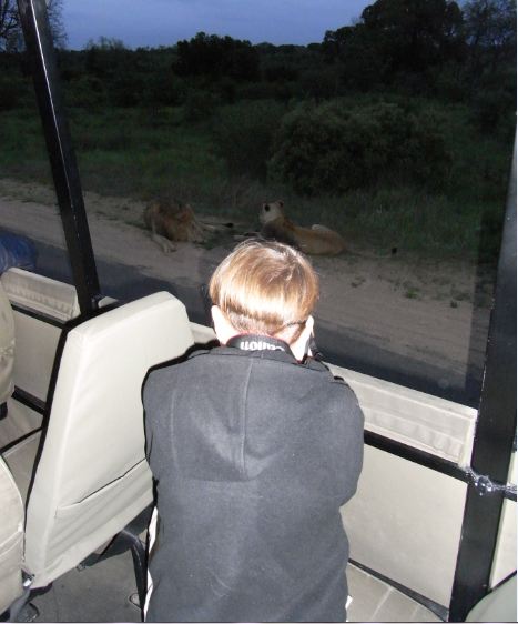 Um 03.00 Uhr klingelt heute der Wecker, denn wir müssen um 03.45 Uhr am Abfahrtspunkt für den Morning Drive sein. Nach einem schnellen Frühstück geht es los. Wir sind überrascht, wie warm es ist, ich überlege kurz, meine Fleecejacke zuhause zu lassen. Am Treffpunkt ist es stockfinster, einige Leute warten schon. Pünktlich um 04.00 Uhr ist Abfahrt, mit uns sind ca. 20 andere Personen im Fahrzeug, die Straßenränder werden mit starken Scheinwerfern ausgeleuchtet. Die erste Stunde tut sich gar nichts, nicht mal eine Impala steht am Straßenrand. Gott sei Dank habe ich die Fleecejacke mitgenommen, durch den Fahrtwind ist es nämlich deutlich kühler, als wir am Anfang gedacht haben. Wir beneiden die Leute, die offensichtlich mehr Erfahrung in Sachen Morning Drive haben und sich aus dem Zimmer eine Decke mitgenommen haben. Dann, nach einer Stunde, als sich schon langsam Unruhe in dem Safarifahrzeug breit macht, liegt plötzlich wie bestellt ein Löwenpärchen am Straßenrand