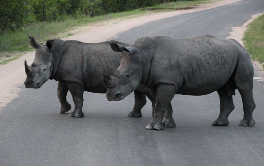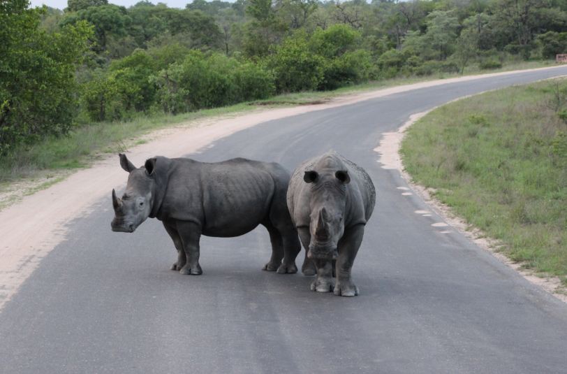 Jetzt ging es Schlag auf Schlag, kaum waren wir weitergefahren, stand plötzlich ein Nashorn-Pärchen auf der Straße. Ihm gefiel die plötzliche Anwesenheit unseres Fahrzeugs gar nicht und der Bulle nahm Anlauf in Richtung Auto. Unser Fahrer entschied sich, es nicht auf eine Konfrontation ankommen zu lassen und setzte zurück.