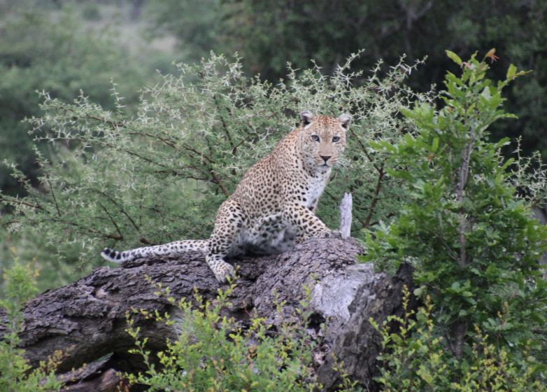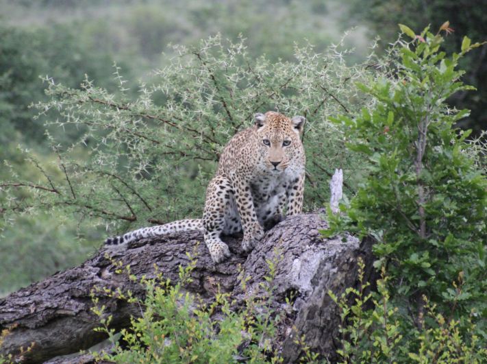 Mit den Nashörnern haben wir schon 4 der Big Five zusammen, es fehlt nur noch der Leopard. Plötzlich ruft ein Mitfahrer in unserem Fahrzeug "Stop" und da liegt ein Leopard, wie aus dem Bilderbuch auf einem Baumstamm: