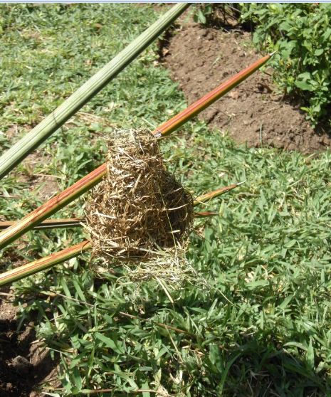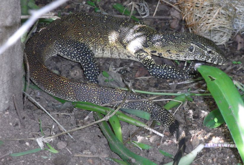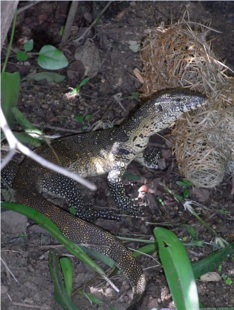 Offensichtlich hat die Echse ein Webervorgelnest, das zu niedrig aufgehängt war, runtergezogen und machte sich über die Eier her.
