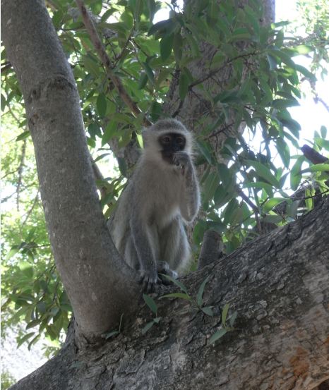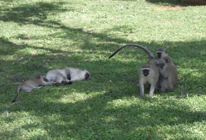 und so gehen meine Tochter los, um den "Waschsalon" aus zu kundschaften. Im Gegensatz zu Mopani scheint hier die Waschmaschine zu funktionieren, jedenfalls gibt es kein "out of order" Schild. Da wir weder das passende Kleingeld noch Waschpulver haben, ziehen wir weiter in den Shop im Camp, wo wir neben Waschpulver auch Postkarten und ein paar kleine Souvenirs erstehen. Unterwegs beobachten wir eine Gruppe Grünmeerkatzen, die auf einer Wiese spielt