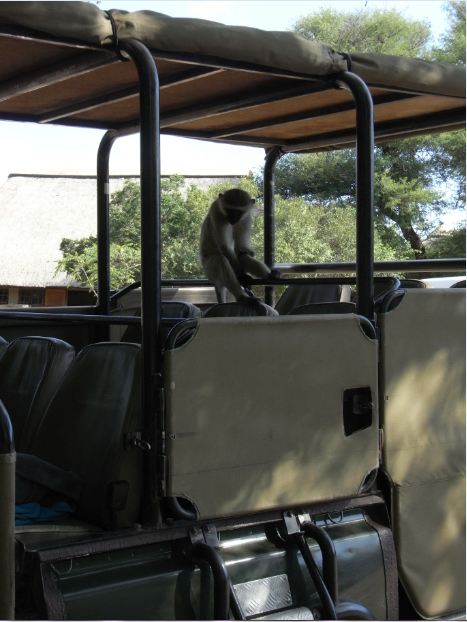 Natürlich findet meine Tochter die Äffchen suuuuuper süß - genau bis zu dem Moment, an dem plötzlich und ohne Vorwarnung einer der Affen wütend fauchend und die Zähne fletschend auf meine Tochter zustürmt. Uns beiden fällt nichts Besseres ein, als kreischend weg zu rennen, was den Affen erst recht animiert, auf meine Tochter los zu gehen. Zum Glück schlägt er sie nur auf's Bein.  Was diese Attacke ausgelöst hat wissen wir nicht, denn wir standen rund 6 Metern von den Affen entfernt und haben uns ruhig verhalten. Später beobachten wir dieselben Affen wie sie einen Mülleimer ausräumen und ein Safarifahrzeug entern: