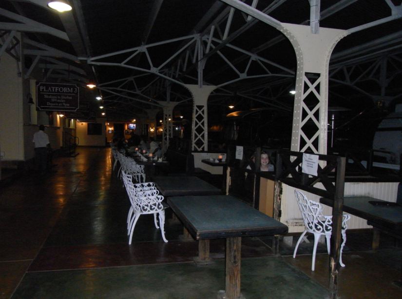 Irgendwie verbummeln wir den Rest des Tages mit dösen, lesen, Postkarten schreiben und spazieren gehen. Eigentlich etwas schade angesichts des schönen Wetters (genießt es, es ist der zweite und letzte sonnige Tag dieses Urlaubs!), aber ich kann meine Mannschaft heute nicht zu größeren Aktivitäten überreden. Relativ früh gehen wir dann zu Abend essen, im Selati Train Restaurant, einem anscheinend privat geführten Restaurant in Skukuza. Die Restaurants in den Camps im Krügerpark sind alle in der Hand eines einzigen Konzessionärs und die Speisekarte ist überall mehr oder weniger identisch. Das Selati Restaurant bildet eine angenehme Ausnahme, dazu kommt noch die sehr nette Atmosphäre. Man sitzt nämlich auf dem Bahnsteig des alten Krüger Bahnhofes, daneben stehen eine alte Dampflok und ein Waggon, in dem sich eine Bar befindet. Das Ganze ist schön beleuchtet.