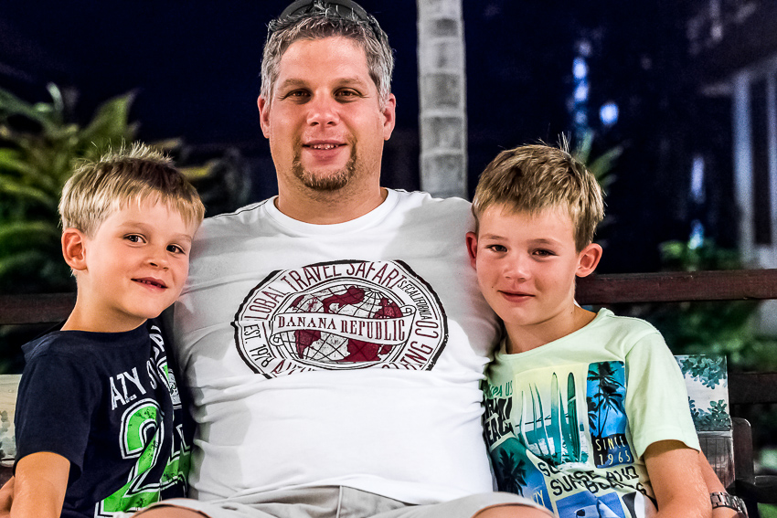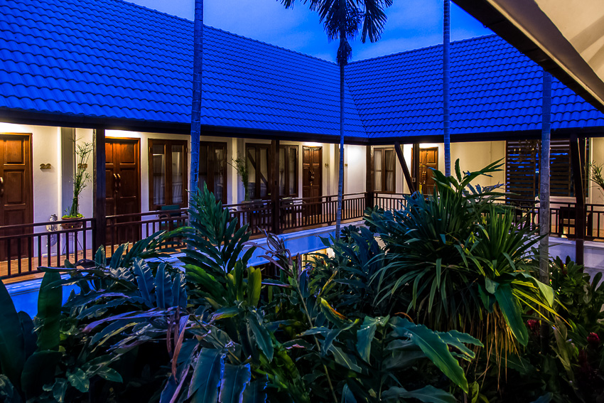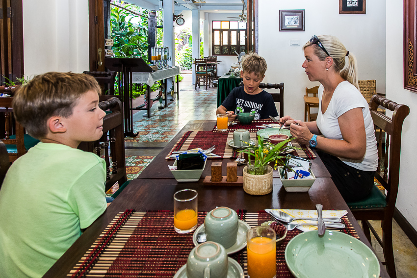 Um 07.00 bimmelte der Wecker unerbittlich. Schlaftrunken klopfte ich an die Tür unseres Nebenzimmers und weckte Birgit. Na ja, Sie war schon wach, alles andere hätte mich auch gewundert. Während wir uns langsam fertig machten weckten wir die Jungs vorsichtig. Nachdem diese (vor allem Paul, Tom hat da meistens weniger Probleme mit) dann so langsam ansprechbar und angezogen waren, ging es runter zum Frühstücken. Es war eine kleine, im freien gelegene, Frühstücksecke mit ausreichend gutem Buffet. Tom hatte keinen Appetit und ging daher leer aus, der Rest der Family aß bis jeder so weit satt war. Danach machte ich noch einmal ein paar Fotos der Hotelanlage bei Tageslicht, ehe wir uns für die heutige Tagestour fertig machten.