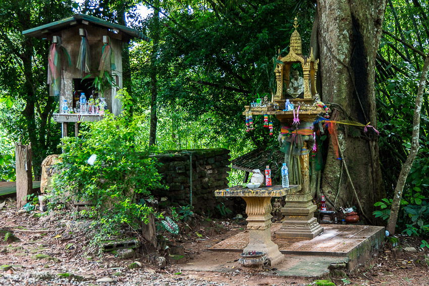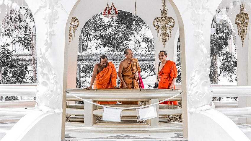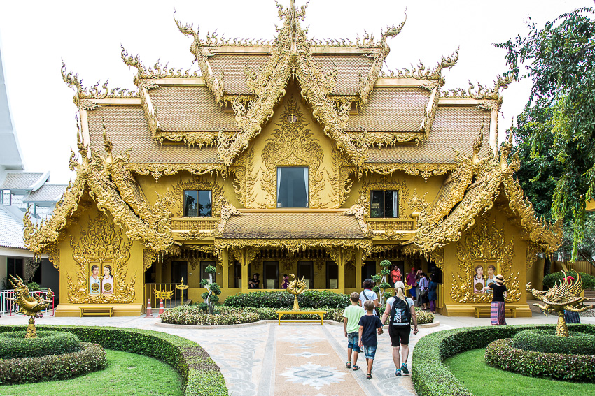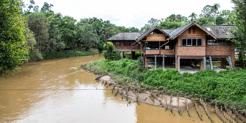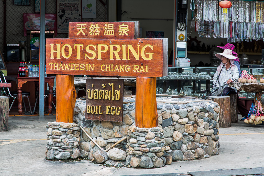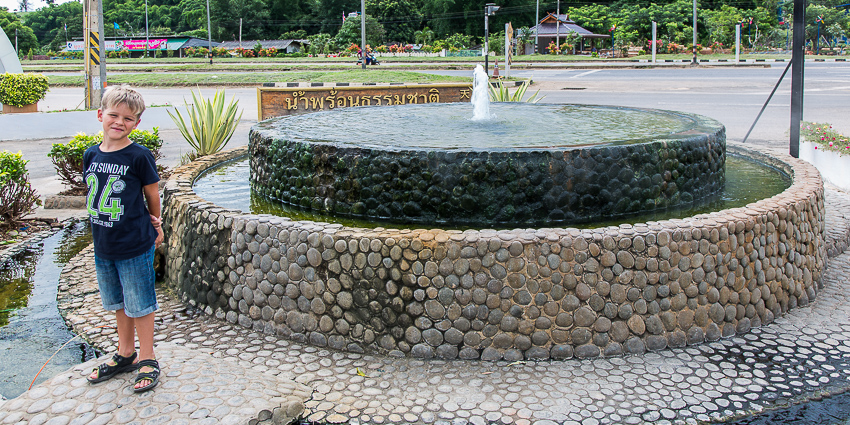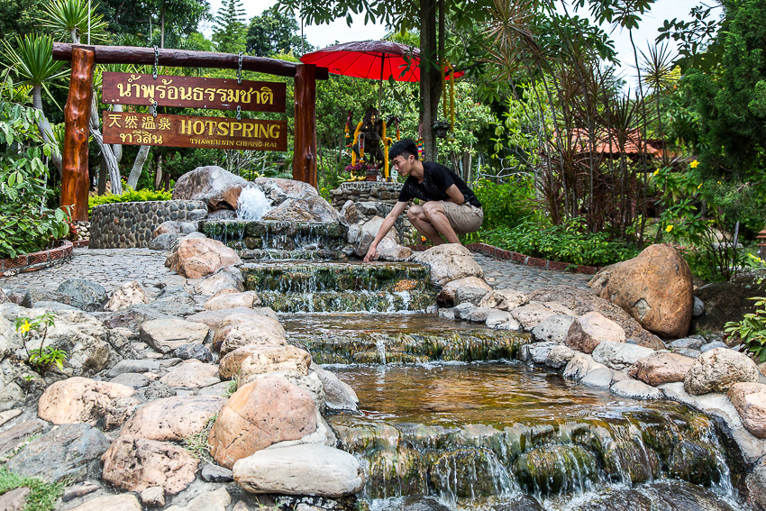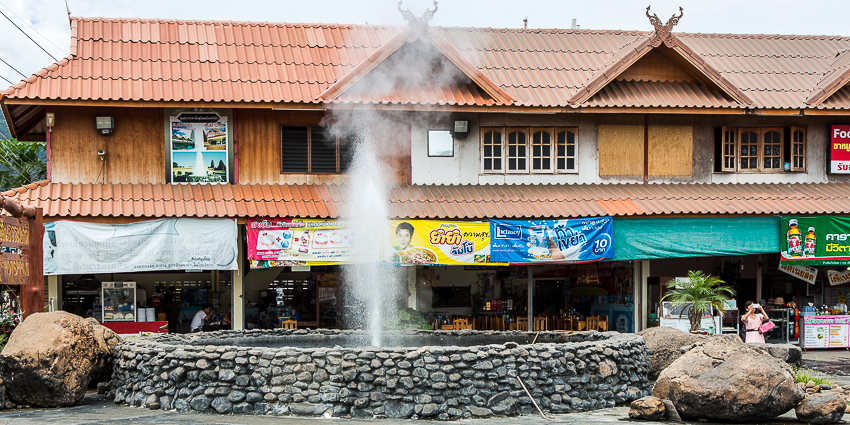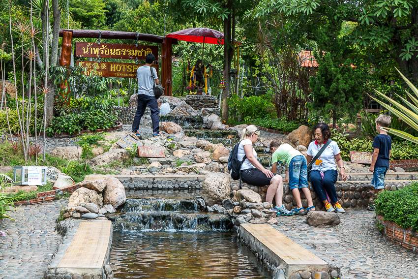 Pünktlich wurden wir von Toom und No um 08.30 abgeholt. Die Fahrt bis zum ersten Highlight des heutigen Tages dauerte eine Stunde, dann kamen wir an den heißen Quellen von „Wiang Pa Pao" an. Wir schauten uns die leicht nach Schwefel riechenden 80° heißen  Quellen an und nahmen mit den Füßen ein kurzes Bad in einer der nicht ganz so heißen Quellen. Birgit kaufte einer Verkäuferin für je 10 Baht zwei aus Stroh geflochtene Armbänder für die Jungs ab. Außerdem bewunderten wir einen privat erbauten Tempel im Stile derer die es in Kambodscha gibt. Laut Toom weiß allerdings kein Mensch den genauen Sinn und Zweck diese Bau’s.