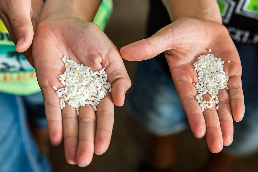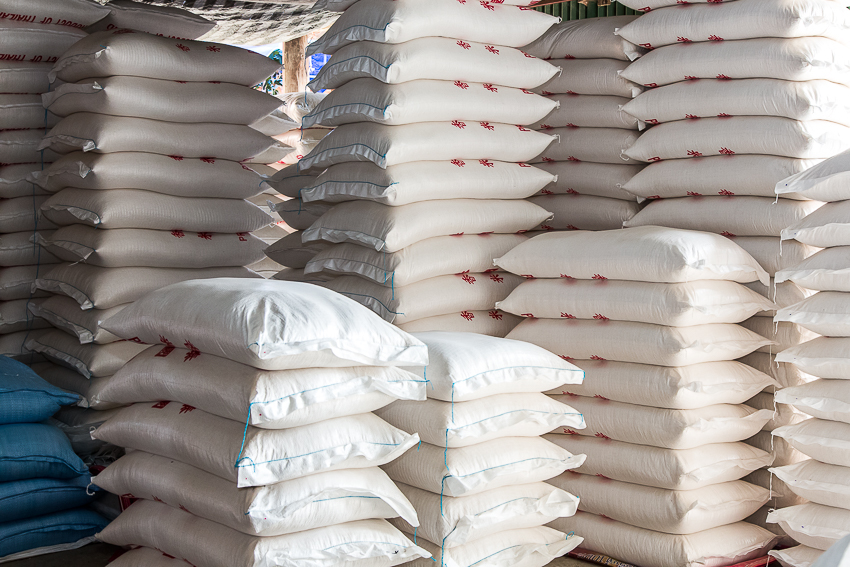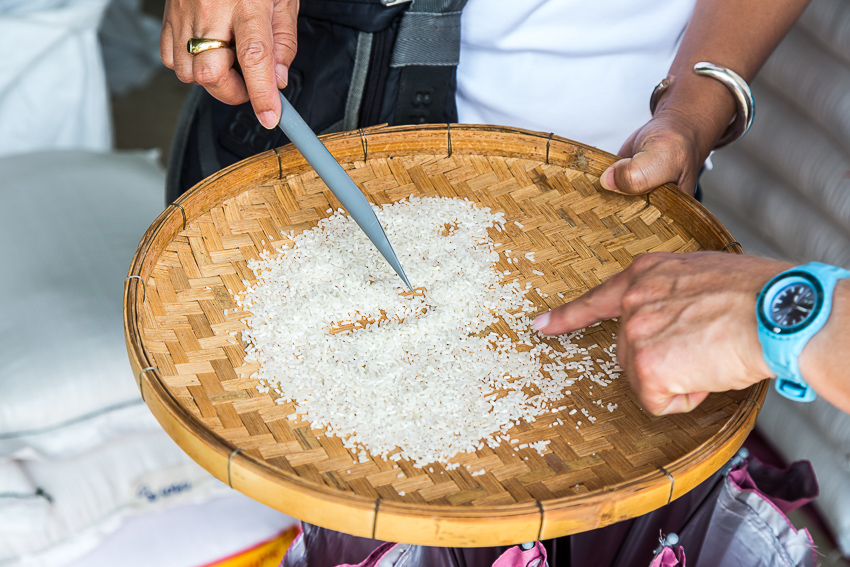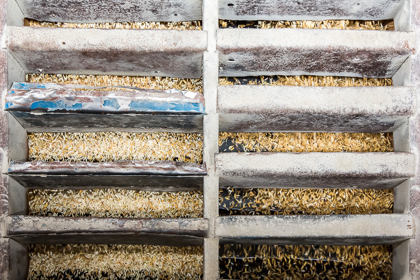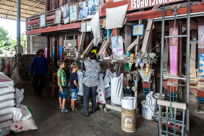 Dann ging es weiter zu einer kleinen Fabrik, wo wir zuschauten wie die verschiedenen Reissorten aufgearbeitet wurden. Tom und Paul schauten fasziniert zu, wie die Maschinen den Reis rüttelten und die Körner von der Schale getrennt wurden. Dann wurde er in Säcke abgefüllt.