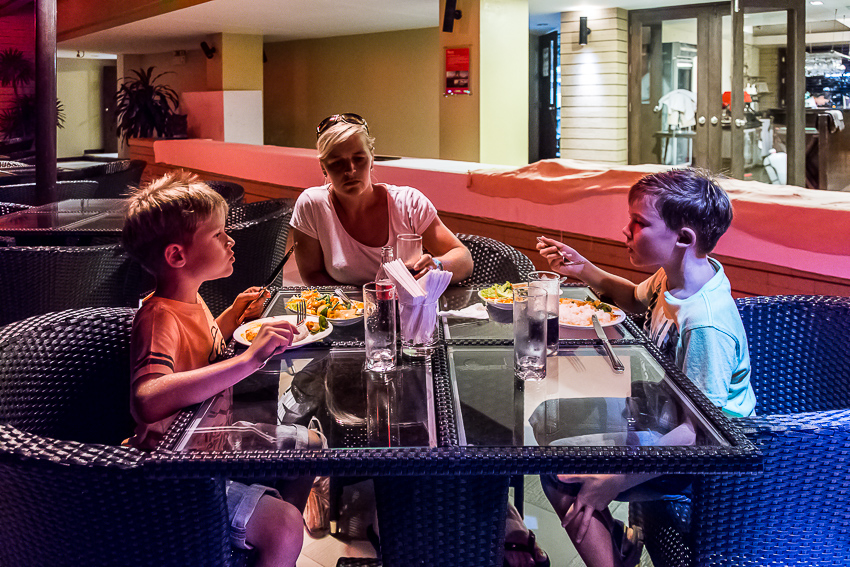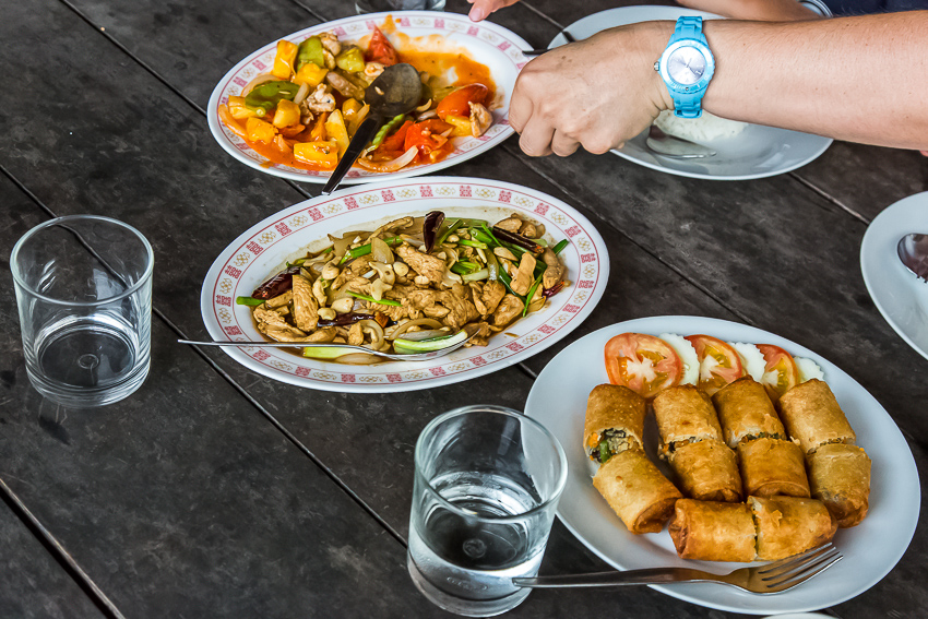 Außer uns war nur noch ein Tisch mit einer Horde Chinesen auf der schönen Terrasse des Hotels belegt. Wir bestellten für Tom und Paul je eine Portion Reis mit Hühnchen süß/ sauer. Den Kindern schmeckte es - bis auf die leichte Schärfe - hervorragend. Dazu noch 4 Cola und alle waren zufrieden. Alles in allem für knappe 500 Baht (12,-Euro) - wesentlich billiger als in Bangkok.