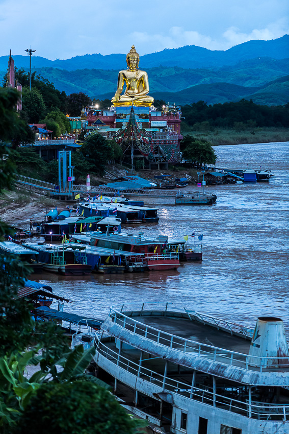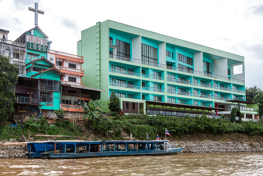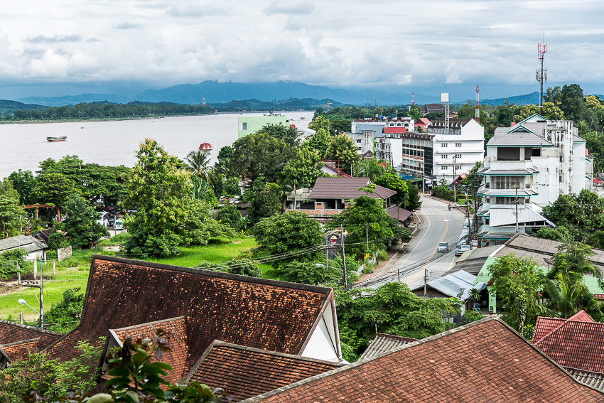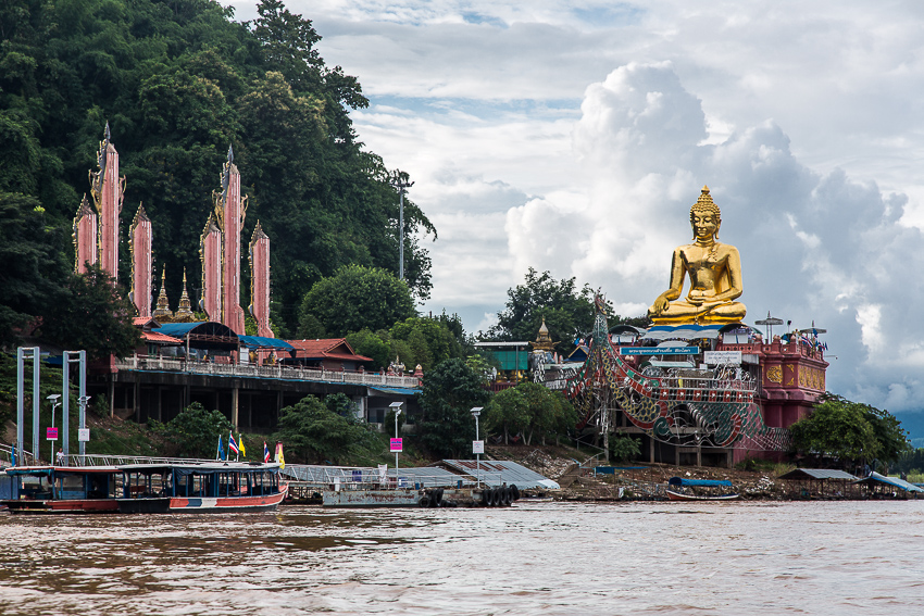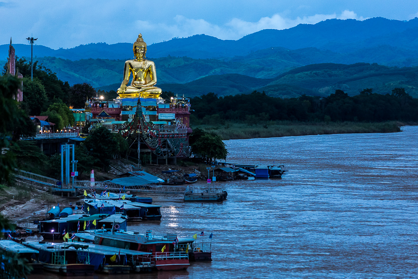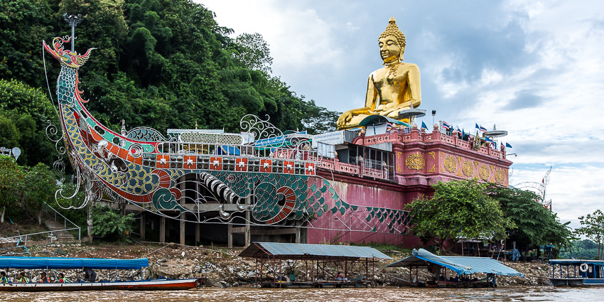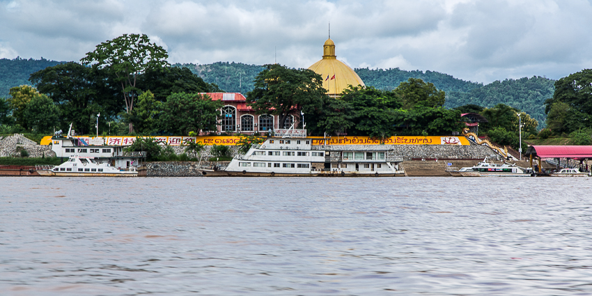 Die letzte Fahrt des heutigen Tages führte uns dann nach „Chiang Saen“. Mit dem Bus fuhren wir zum schönsten Aussichtspunkt der Stadt und liefen dann von dort an zwei kleinen Tempeln vorbei zum örtlichen „Hafen“. Von dort aus unternahmen wir eine ca. halbstündige Fahrt mit einem LongTailBoat auf dem berühmten Mekong Fluss im goldenen Dreieck. Hier treffen sich die Grenzen der Länder Thailand, Laos und Myanmar und bis ins letzte Jahrhundert wurde hier mit Opium gehandelt. Mittlerweile steht, zumindest in Thailand, hierauf die Todesstrafe.