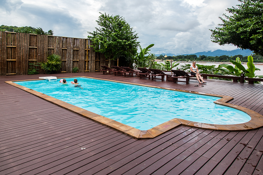 Das eigentlich auch noch für heute geplante Opium Museum wurde auf morgen früh verschoben. Die Kinder wollten noch einmal kurz in den Hotelpool und so fuhren wir zu unserem heutigen Übernachtungsziel - dem „Serene at Chiangrai", direkt am Mekong Fluss gelegen und mit einem ebenso tollen Ausblick auf den Fluss. Zwei nebeneinander liegende Zimmer wären nur noch zur Straßenseite hin frei gewesen, so entschieden wir uns - auch wenn es alles etwas umständlicher machte - trotzdem für zwei Zimmer auf unterschiedlichen Stockwerken. Zimmer 309 und 409.