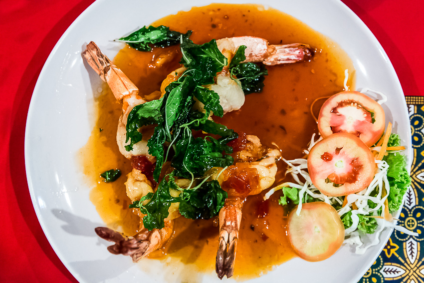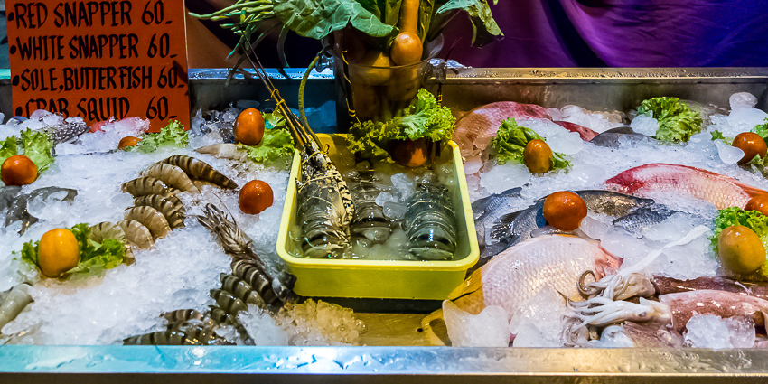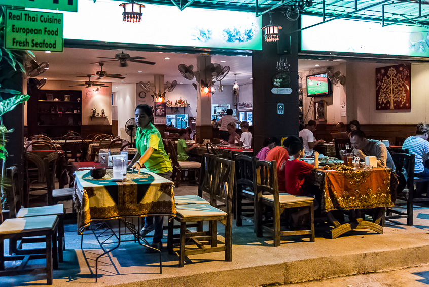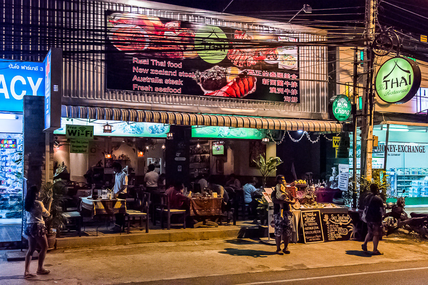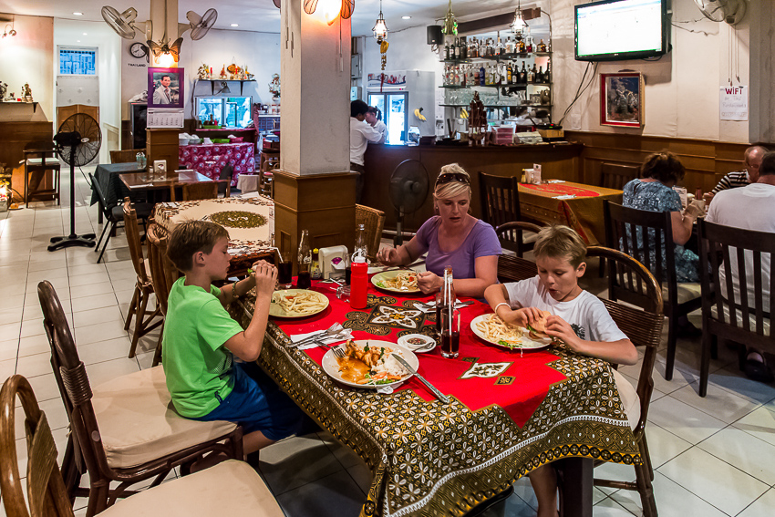 Gegen kurz vor 19.00 machten wir uns dann auf den Weg was Essbares zu finden. Da wir heute keine große Lust mehr hatten auf Entdeckungstour zu gehen, liefen wir einfach auf die gegenüberliegende Straßenseite. Dort war ein relativ schönes Lokal mit frischem Fisch und sogar europäischen Speisen. Wir fackelten nicht lange rum und blieben an Ort und Stelle. Die Kinder entschieden sich für einen Burger mit Pommes, Birgit aß einen leckeren Papaya- Salat und ich genehmigte mir King Prawns mit süß-sauer Chili Sauce und einer Portion Reis. Alles war seeehr lecker. Alles zusammen zahlten wir 960 Baht (rund 25 Euro), wovon der Löwenanteil wahrscheinlich auf meine King Prawns fiel.