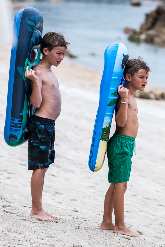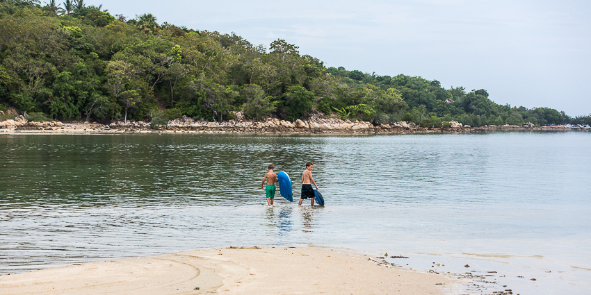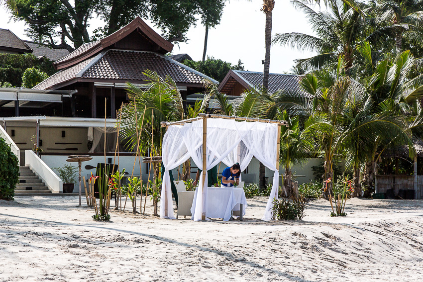 Heute konnten wir das erste mal so richtig schön ausschlafen. Es blieb beim „konnten“, Tom war trotzdem um 07.30 wach und auch Birgit und ich konnten dann nicht mehr so richtig einschlafen. Paul ließ dann ebenfalls nicht mehr lange auf sich warten. Draußen regnete es zu unserer Überraschung dauerhaft und so fiel uns das faulenzen und liegen bleiben noch etwas leichter. Daher durften die Kinder den „Deutsche Welle“ Kanal anschauen, damit Birgit und ich wenigstens noch etwas dösen konnten. Um 09.30 gingen wir dann runter zum Hauptpool, dort gab es das leckere Frühstücksbuffet - nicht ganz so groß und variantenreich wie im Anantara Bangkok - aber trotzdem sehr lecker. Nach dem ausgiebigen Frühstück gingen wir wieder in unser Zimmer, die Kinder planschten eine Zeit lang im Pool. Nach einer Stunde gingen wir wieder zum Strand. Birgit hatte den Jungs versprochen, bei Ebbe zu einer kleinen vorgelagerten Sandbank zu laufen. Das Wetter war immer noch mäßig, es war bedeckt und das Wasser war deutlich "frischer" als gestern.