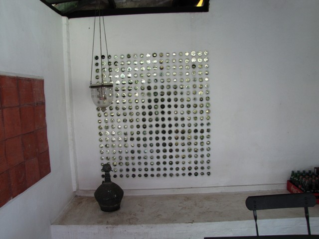 die Außenwand ist mit Weinflaschen gemauert. Von innen:
