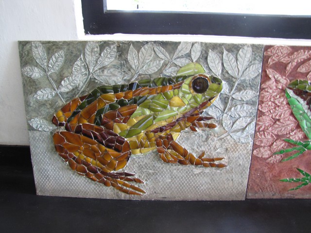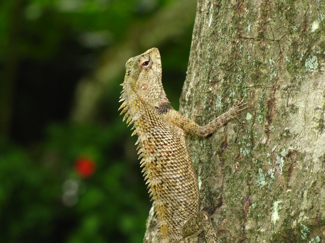 eine Touristin weist mich darauf hin, dass beim ayurvedischen Restaurant immer eine große grüne Echse rumläuft, na da muss ich doch gleich mal schauen, tatsächlich da läuft eine über die Brücke: