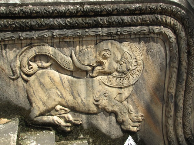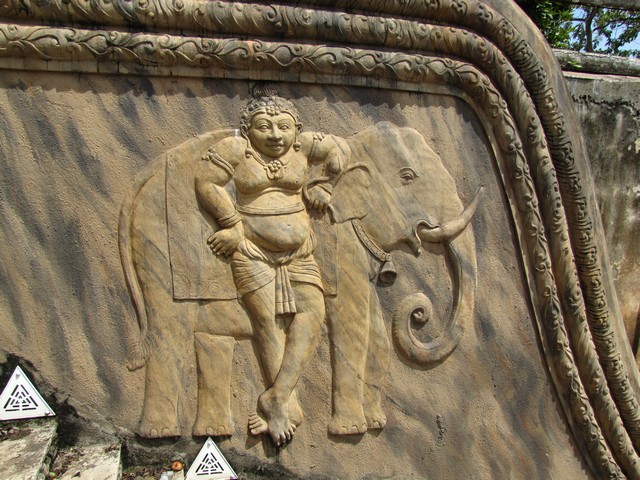Unser Fahrer hat tatsächlich vor dem Haus gewartet (ein bisschen mulmig war mir schon, hier wären wir allein total verratzt gewesen) und fährt auf dem Rückweg an einem Kloster vorbei. Im Garten des Klosters steht ein imposanter Elefant: