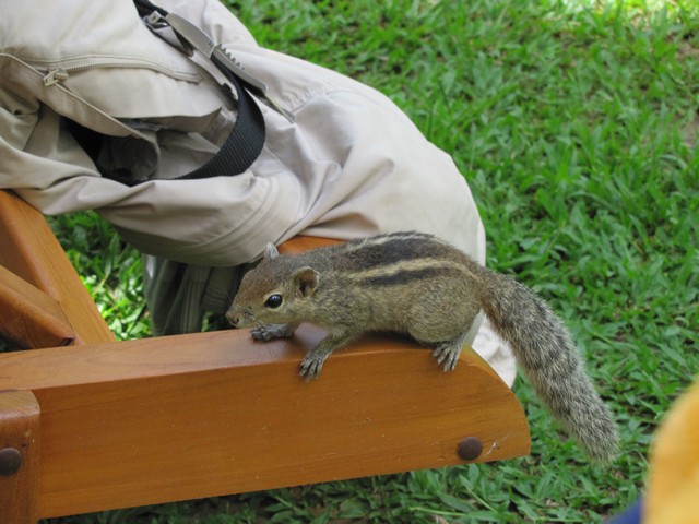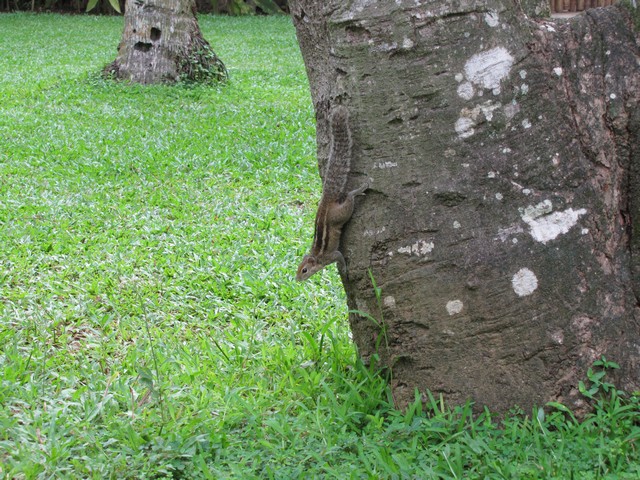 Das Wetter ist schön und wir legen uns in den Garten unter die Palmen. Hier hat mein Freund nun endlich Gelegenheit ein Streifenhörnchen zu fotografieren, die sind hier ganz zahm und lassen sich aus der Hand füttern (was natürlich verboten ist aber eine russische Touristin füttert sie trotzdem mit Ananas)