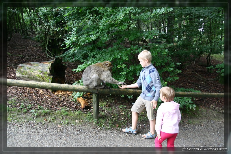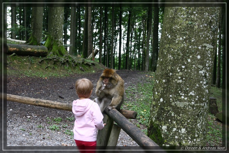 Nachdem wir aufgewaschen, zusammengepackt, den Stellplatz bezahlt und die Chemie-Toilette geleert hatten, verließen wir den Campingplatz gegen 10:30 Uhr. Wir fuhren auf der B33 bis zum Kreuz Hegau und bogen dort auf die A98 ab, welche bei Stockach in die B31n überging. Unser Ziel war der Affenberg in Salem, wo wir ca. 11:20 Uhr eintrafen. Hier spaziert man durch ein großes Waldstück, in dem sich über 200 Berberaffen frei bewegen. Der Clou – nicht nur für Kinder – ist, daß man die Affen mit speziell zubereitetem Popcorn sogar füttern darf: Man hält es ihnen auf der flachen Hand hin und sie nehmen es sich ganz brav weg… faszinierend!
