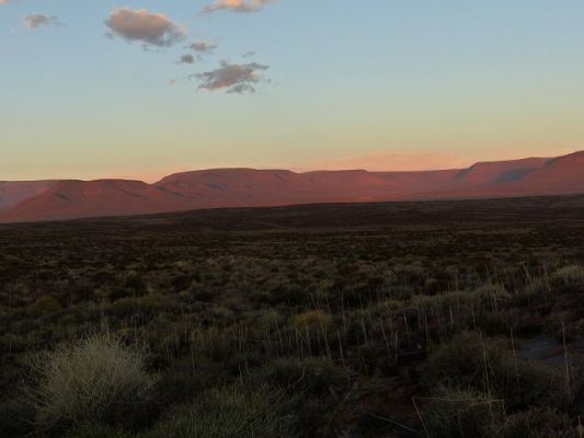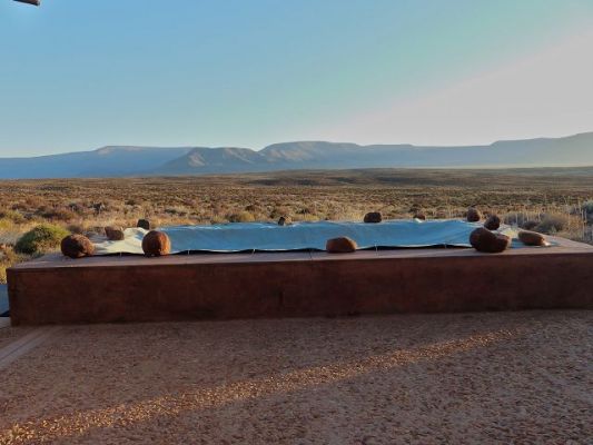 Die Vögel zwitschern, die Luft ist noch frisch und die Sicht auf die Roggeveld Mountains ist schön, wenn auch leider aufgrund des Gegenlichts nicht für gute Fotoaufnahmen geeignet.