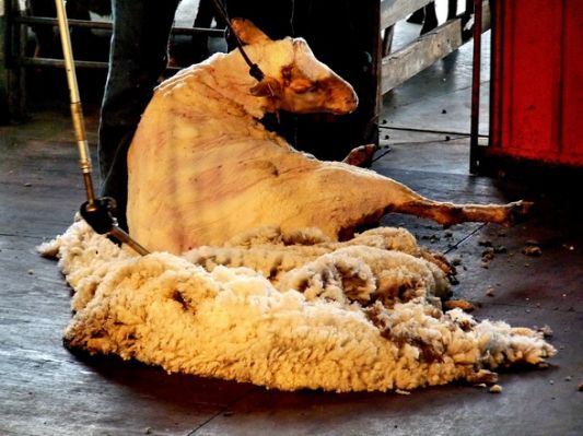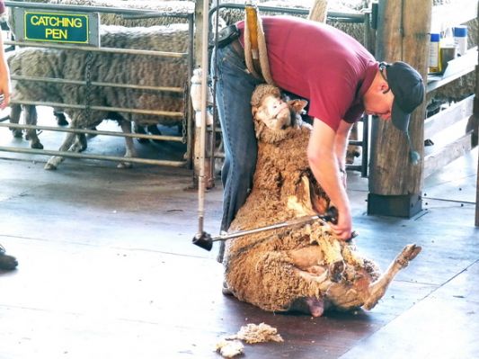 Dann hat der Ranger vorgeführt, wie man ein Schaf das Fell abrasiert und hat viele Erklärungen dazu gegeben. Auch, dass wenn man sehr schnell beim Schneiden ist, viel geld am Tag verdienen kann..Ich möchte auch ein Schafsrasierer sein...........