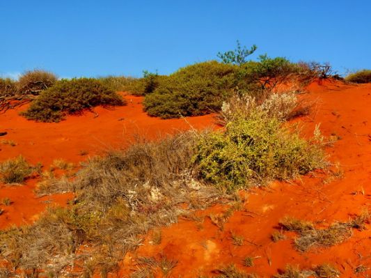 Wir wollen aber einen anderen Weg dorthin gehen. Eine Dirt Road führt direkt an die Lagune, allerdings nur mit 4 WD machbar, wegen tiefem sand. Wir stellen unseren Wagen ab und finden einen kleinen Trail, den wir ca. 1,5km laufen. Sehr schön mit dem Kontrast der roten Erde: