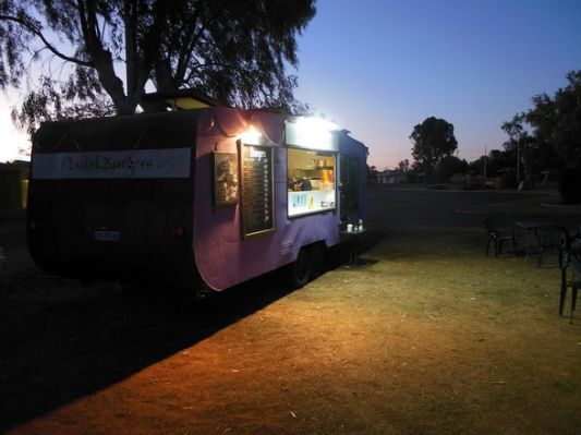 So, jetzt geht es aber zurück nach Exmouth. Wir kaufen noch im Supermarkt ein und es ist auch schon dunkel. Im Internet hatte ich mir eine Addressse rausgesucht, wo es die besten Burger in Exmouth geben soll. Das navi führt uns dorthin. Aber Hmmm.....   wir sehen keinen Imbiss oder Restaurant dort. Just als ich weiterfahren wollte, ruft Mike: Guck mal da, da gibt es Hamburger. Wo??? Ach da. ein Wohnwagenimbiss, wie urig ist das denn!!