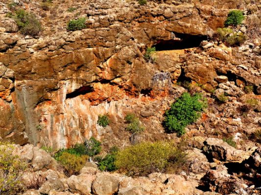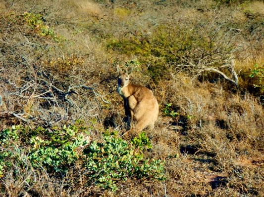 Plötzlich kommen uns die 2 Leute zurück entgegen(junges Pärchen). Sie sagen uns, dass es da vorne nicht weitergeht. Hmmm..... beide haben Badelatschen an und nichts zu trinken mit. Was haben die denn gedacht, wo es hier hingeht. An einen Badestrand und der Weg ist mit weichem Gras untersäht?  Keine Ahnung. Wir gehen natürlich weiter. Und tatsächlich. Ein kurzer Abschnitt ist wirklich gefährlich. Es geht steil auf rutschigen losen Steinen und Felsbrocken hinunter und dann gleich wieder steil hoch. Mit badelatschen hätte ich das auch nicht geschafft. Aber für uns alten Wanderhasen, die nach jeder wanderrung Blasen an den Füssen haben oder sonstirgendwelche Wehwehchen....---- kein Problem. Hier in der Schlucht ist es noch heisser als direkt am Wasser und wir trinken viel. Mike hält aber gut durch. Wir sehen sogar ein Känguruh: