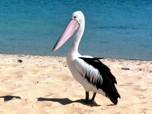 Wir laufen am Strand entlang und sehen erstmal einen Pelikan: