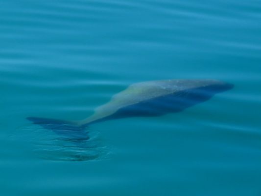 Ihr merkt, das ist nicht so mein Ding gewesen. Da wir nicht rennen, stehen wir hinten in der Reihe und können zunächst nichts sehen. Mir ist das zu blöd und ich gehe auf die Bootsrampe. Von da aus fotografiere ich die Delfine!!!