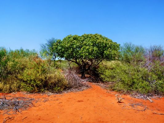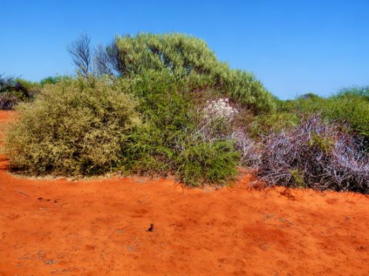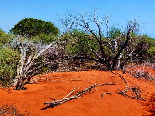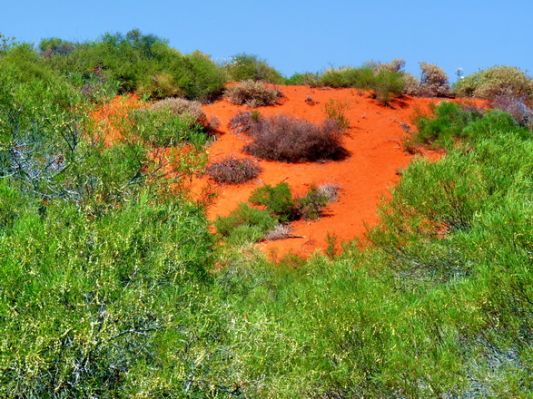 Es geht vom Strand weg los und sogleich haben wir die rote Erde unter uns. Was für ein Kontrast zum weißen Strand.