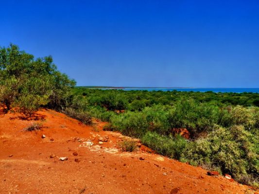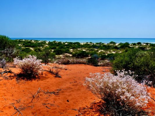 Wir sind sofort begeistert von dieser Landschaft. Das ist für mich eben das wirkliche Australien. Rote Erde und als Kontrast diese Pflanzenwelt dazu. Hier aber ein Blick aufs Meer: