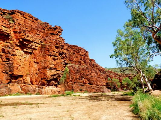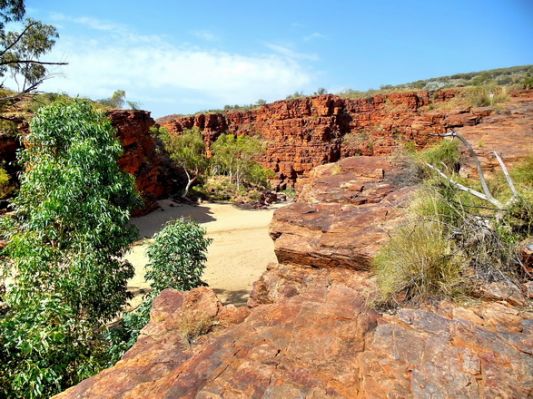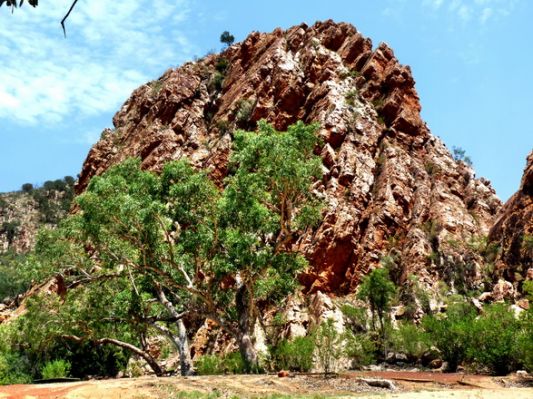 Die Strasse ist asphaltiert, wird aber nach einiger Zeit einspurig, was aber kein Problem ist, weil wir eh die Einzigen sind. Nach über einer Stunde Fahrt erreichen wir den Abzweig zur Trephina Gorge. Diese Strasse ist anfangs asphaltiert und die letzten 4 km sind Dirt Road, aber gut zu fahren. Hier ein erster Stop: