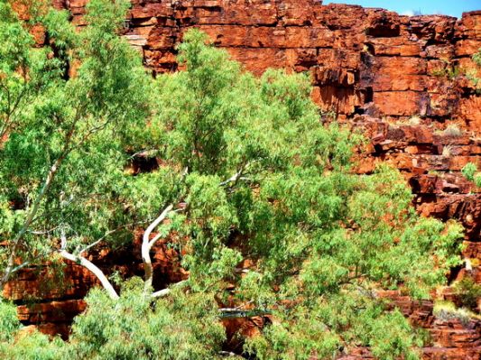 Dann geht es an der Schlucht entlang. Orangefarbene Felswände mit diesen herrlichen grünen Pflanzen begleiten uns: