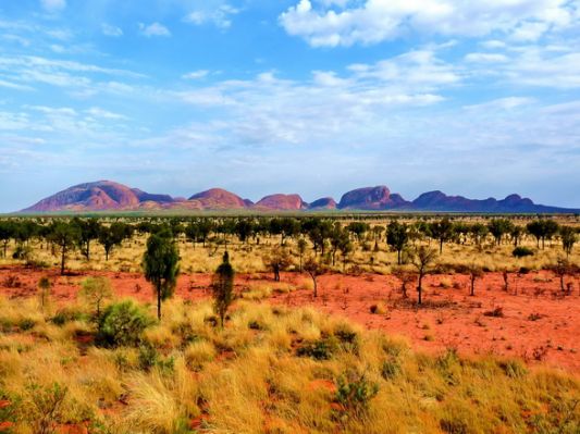 3 Stunden Fahrt sind es zum Ayers Rock. Wir kommen am Mt Connor vorbei, der aber bei Dunst nicht gut zu sehen ist.