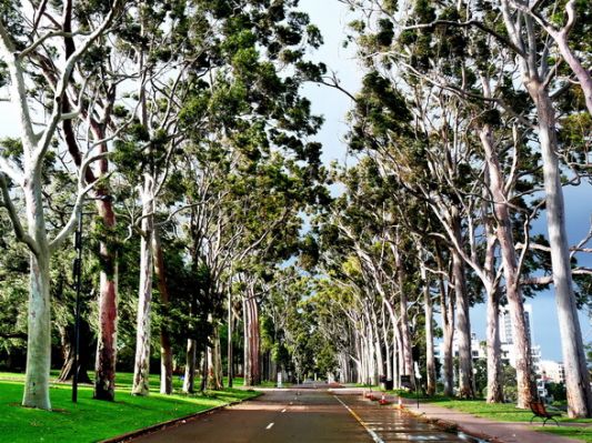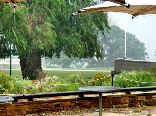 Wir laufen zunächst Richtung Swan River. Wir weichen immer wieder fliegenden Gegenständen aus. Eigentlich ist es viel zu gefährlich. Der botanische Garten liegt auf einem Hügel, den wir hoch müssen. ich muss sagen, der kurze Aufstieg ist ja steiler als der Aufstieg am Kings Canyon. Dann fängt es kurz an zu regnen. Wir stellen uns unter einem Baum und warten, trotzdem werden wir nass.
