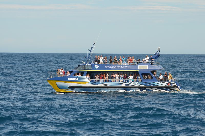 Durch den Jetlag wachen wir um kurz nach 7 schon auf, lassen es aber langsam angehen und frühstücken ausführlich. Kaikoura als Ort selber ist nicht der Rede wert, der wahre Schatz liegt vor der Küste. Wie sonst fast nirgendwo auf der Welt fällt der Meeresboden nahe an der Küste um 1.000m in einen unterirdischen Canyon ab und dieses tiefe Wasser zieht Pottwale an, die dort mehr oder weniger regelmäßig leben und jagen. Ergo gibt es Whale Watching. Wohl organisiert wird man mit einem Bus zum Schiff gebracht und düst dann Vollgas aufs Meer hinaus, wo mit einem Hydrophon nach Wallauten gelauscht wird, der Wal dann geortet und dann dort hingefahren wird. Pottwale tauchen zwischen 45 und 60 Minuten und sind dann immer für etwa fünf bis zehn Minuten an der Oberfläche.