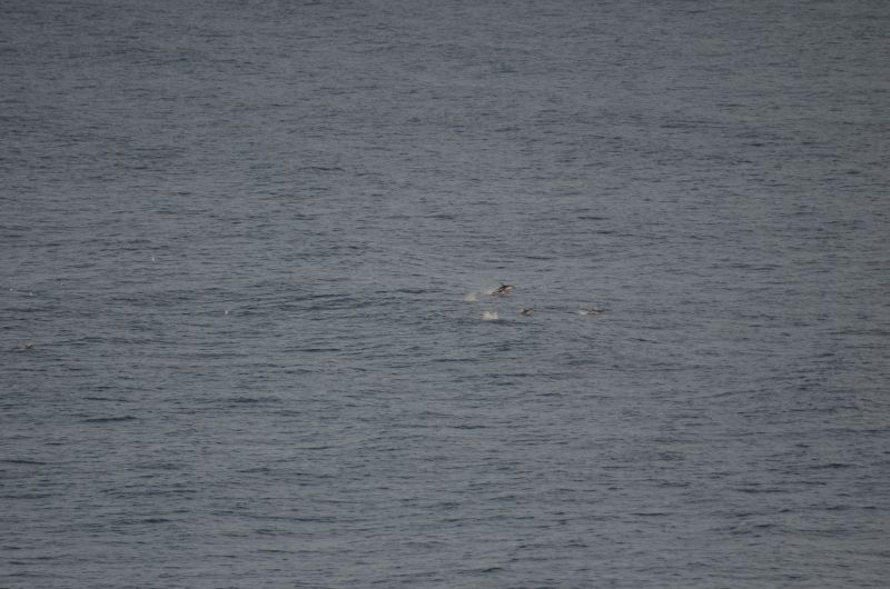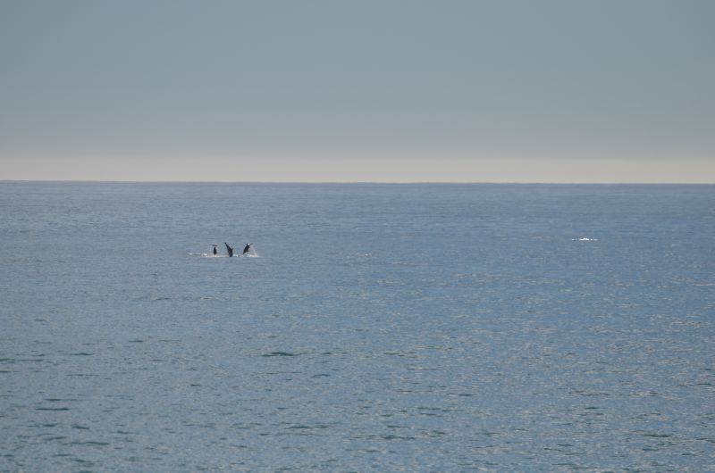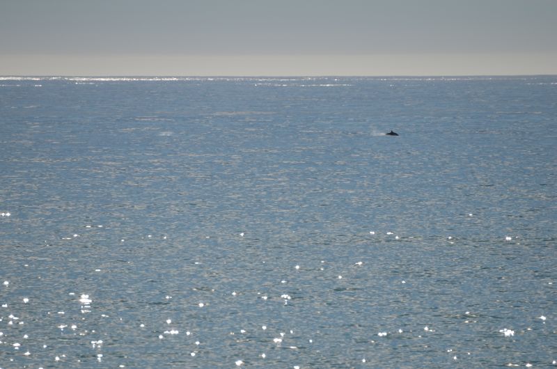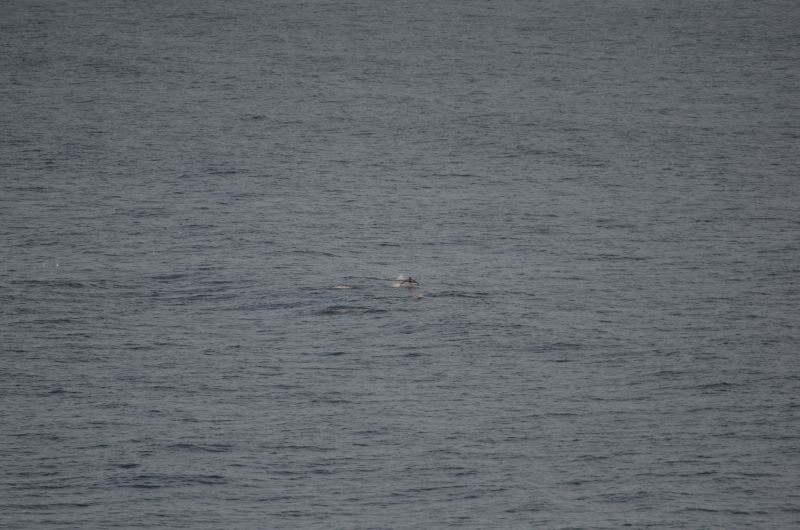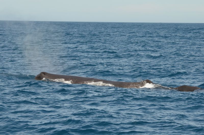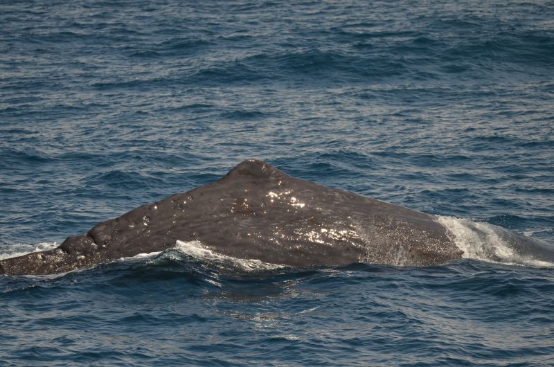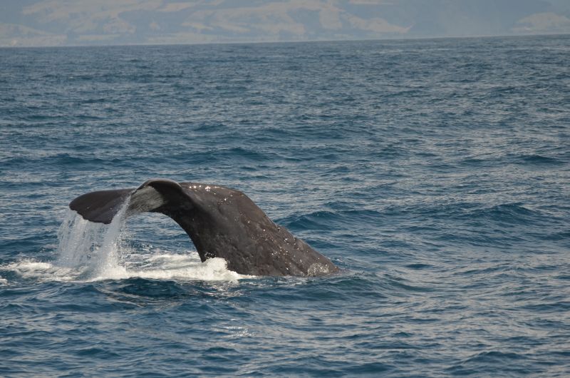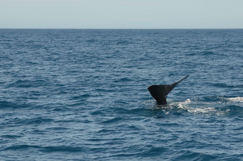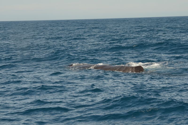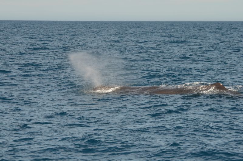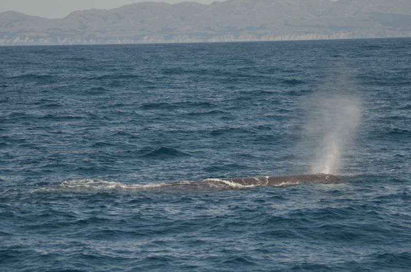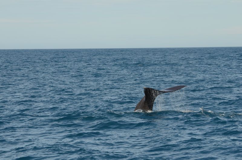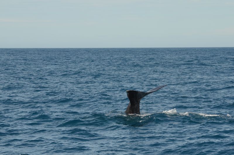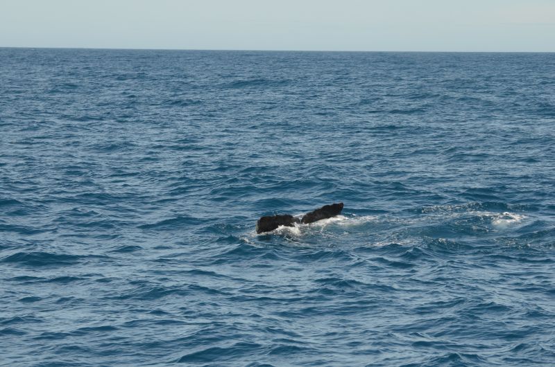 Wir haben das Glück zwei dieser mächtigen und bis zu 20 Meter langen Tiere zu sehen. Sie schwimmen gemütlich an der Oberfläche, schnauben kräftig und tauchen jeweils mit einer schönen Präsentation der Schwanzflosse ab. Beeindruckend. Allerdings zeigt sich auch, dass die „Strong motion sickness“ Warnung vor Tourbeginn nicht unbegründet war. Bei einem Meter Seegang schaukelt es schon gewaltig und Barbara kann mehrfach nicht an sich halten. Passiert.