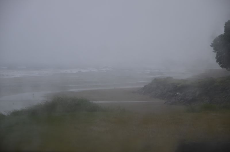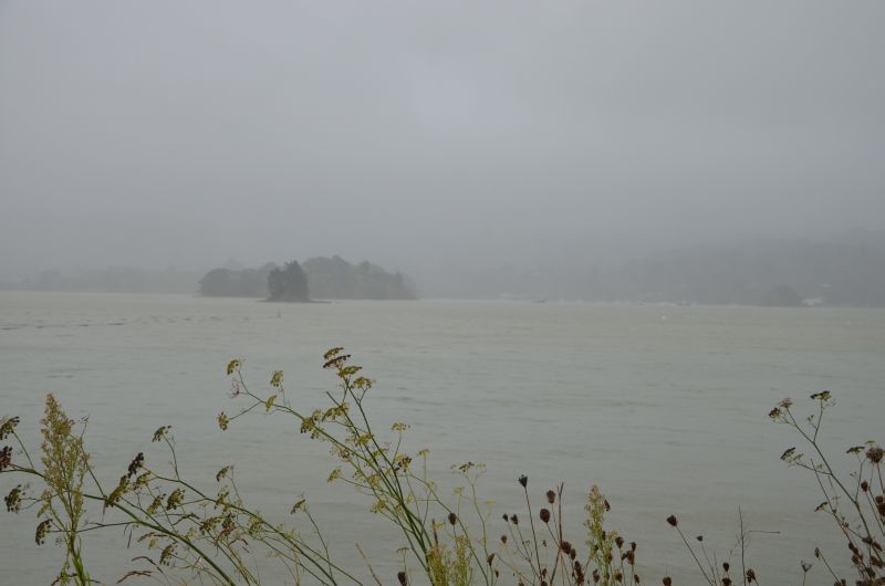 Nach dem Frühstück führt uns unser erster Weg zur Geschichtsstunde in diesem Urlaub, zu den Waitangi Treaty Grounds. Auf dem Weg dorthin kommt man an den Haruru Falls vorbei. Aufgrund des Starkregens schiebt sich dort jede Menge braune Brühe über den Wasserfall in ein geweitetes Flussbett.