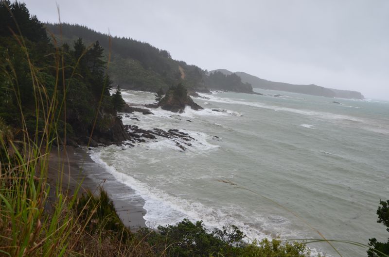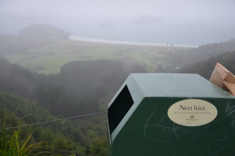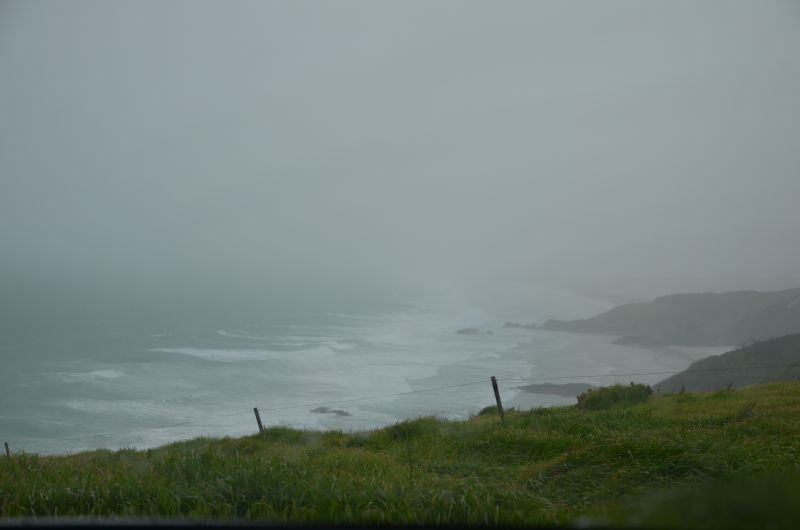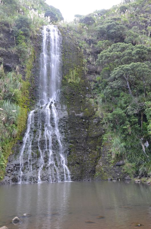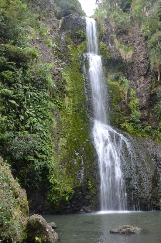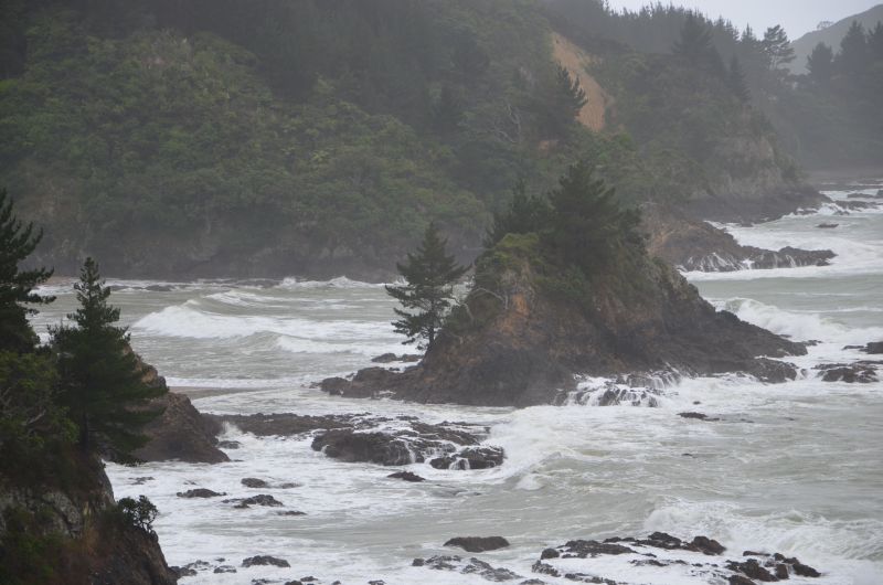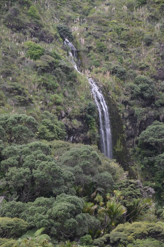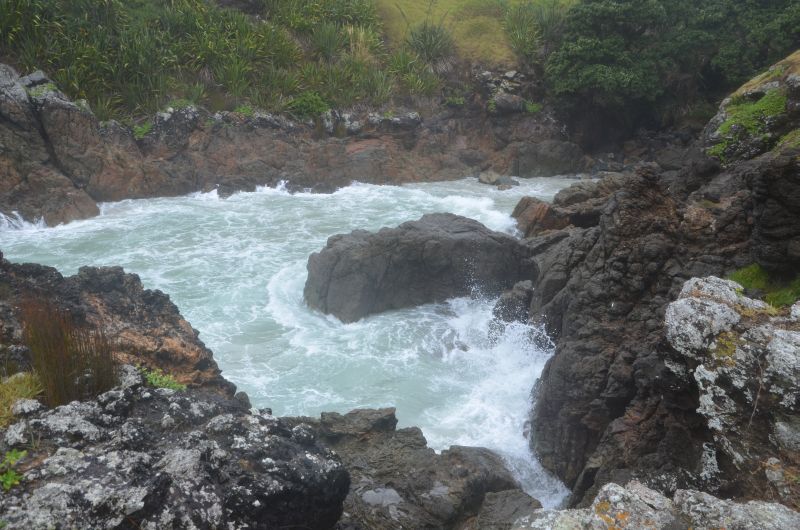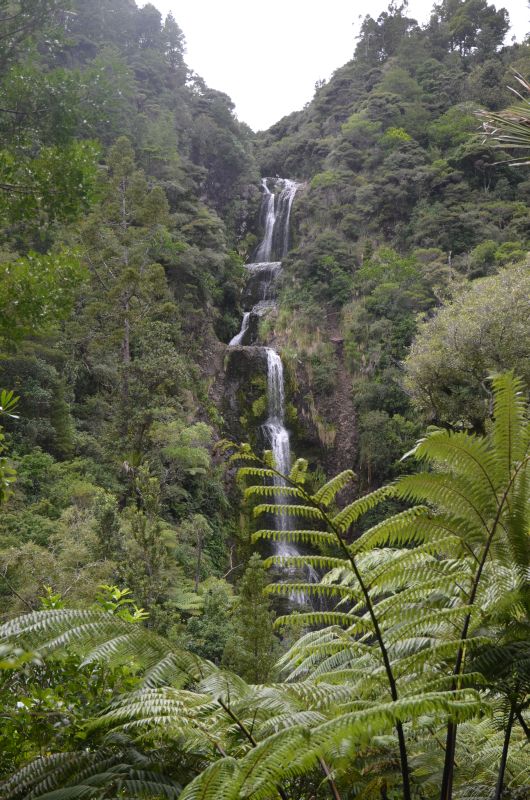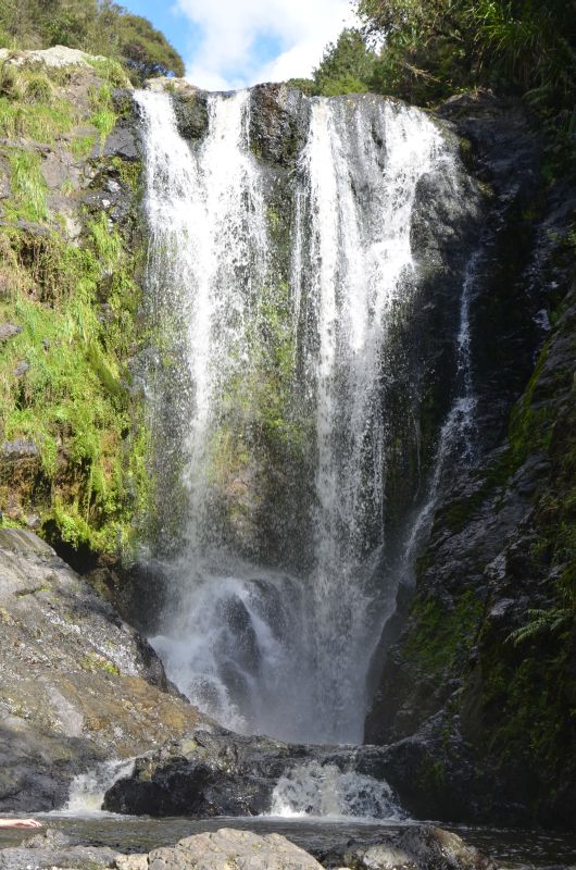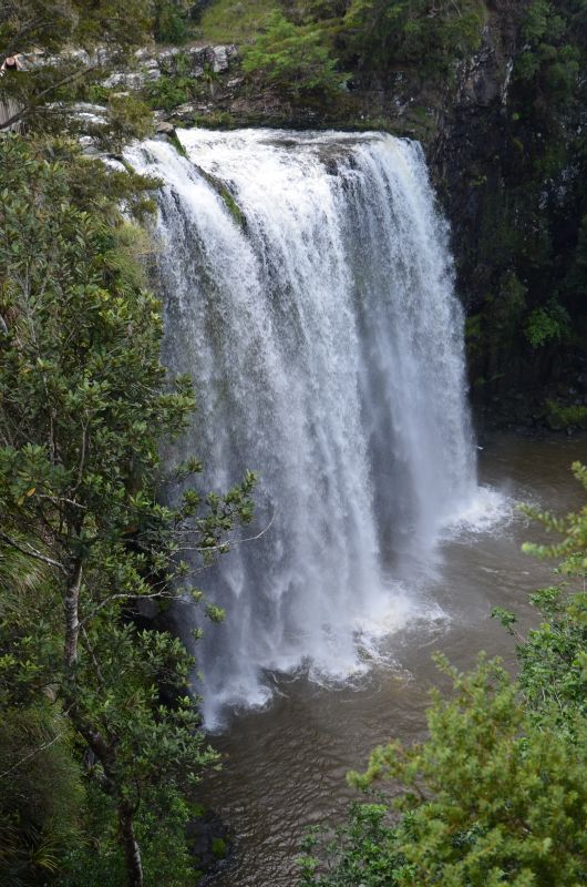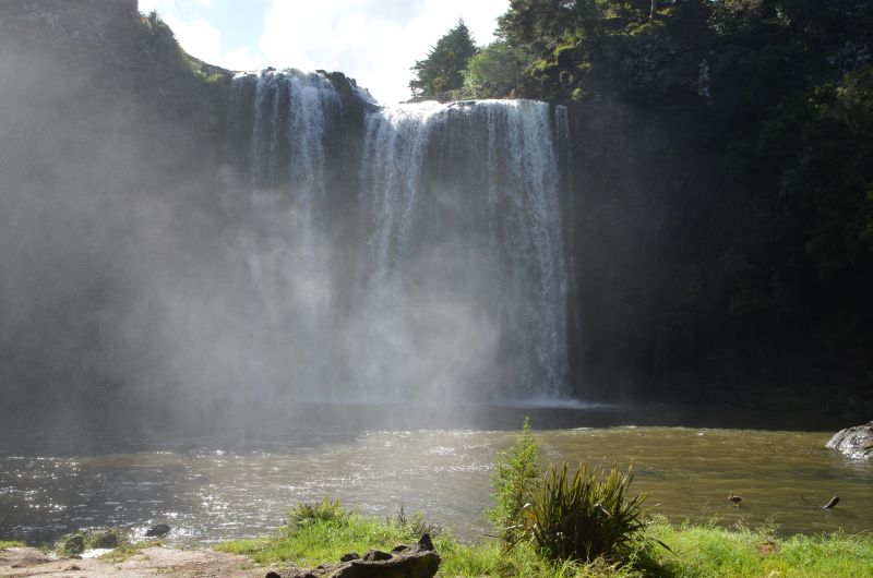 Letzter Wasserfall des Tages sind dann die Rainbow Falls nahe Kerikeri, die höchsten und beeindruckendsten. Als Besonderheit haben diese hinter dem Wasservorhang eine große Höhle, aber bei den heutigen Wassermassen ist weder ein Hineinklettern über glitschige Felsen geschweige denn ein Durchschwimmen des Wasserbeckens möglich.