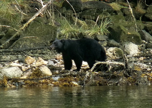 Wir fahren immer wieder dicht an die kleinen Inseln, aber keine Bären in Sicht. Hmm, das ist ja blöd. Aber endlich, da soll ein Bär sein. Am Strand!!! Wo denn?  Ah, da ist er!!