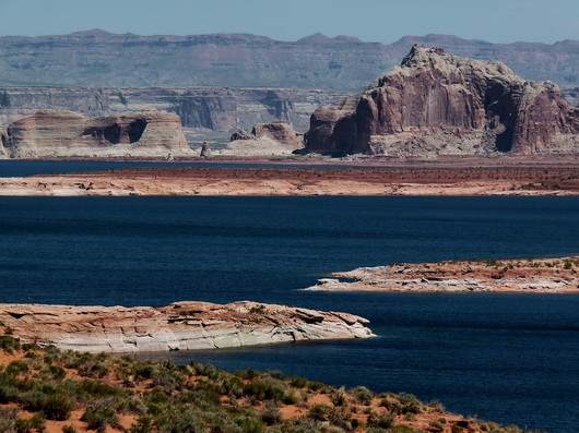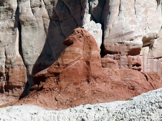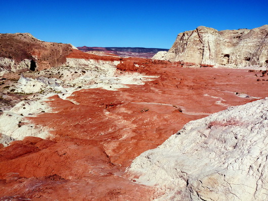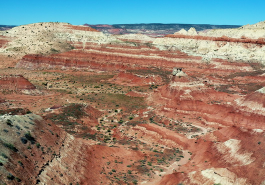 So, jetzt geht die Suche nach den weissen Hoodoos los. Hmm... wo sind die denn? Wenn man vom Trail (Wash) auf den Oberhoodoo zugeht, muss man sich links halten und links am Ende der felswand kurz über Felsen klettern. Wir gehen allerdings zunächst rechts und sind falsch. Dafür aber diese Aussicht: