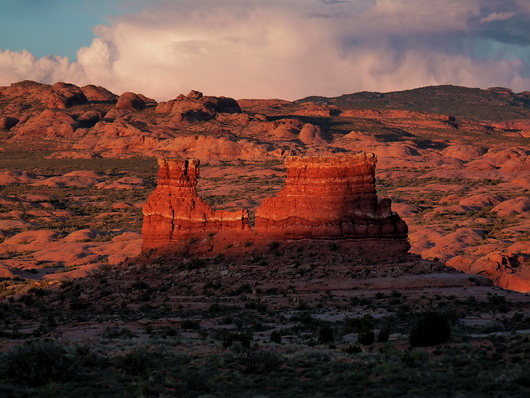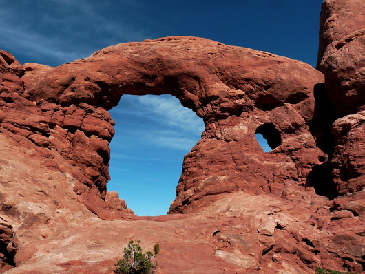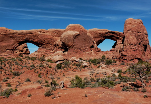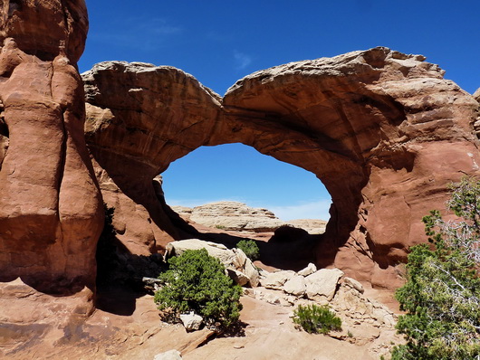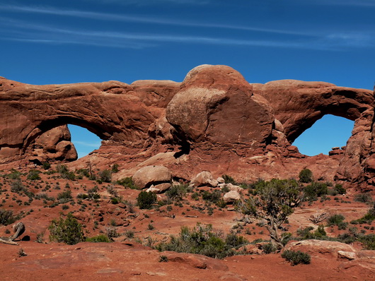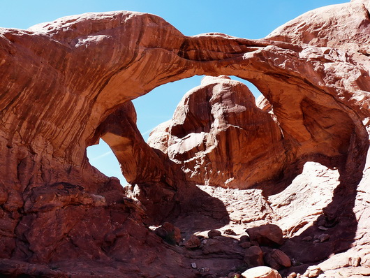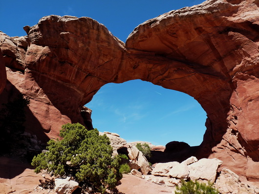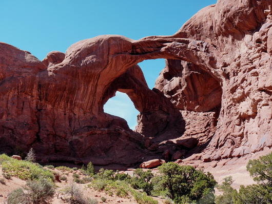 Den gleichen Weg nehmen wir wieder zurück. Irgendwie können wir aber jetzt nicht mehr. Dennoch fahren wir noch zur Windows Section. Es gibt dort 2 Parkplätze. Der obere war proppenvoll, so dass wir wieder ein Stück runterfahren müssen. Zum Parkplatz am Double Arch. Ein kurzer Trail (ca. 800m) führt uns zum Arch.