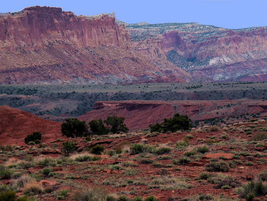Heute schlafen wir mal länger. Es wird erst 6 Uhr 30 aufgestanden. Eine Stunde später geht es dann auch schon los. Wir fahren zunächst auf den Capitol Reef Scenic Drive. Wir sehen am Eingang noch 2 Autos mit ca. 10 Personen mit grosser Fotoausrüstung. Leider ist es bewölkt und die Farben sind eher blass.
