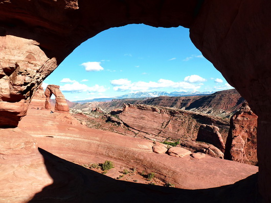 Nach ca. 5 Minuten sehen wir auf dem Trail links ein Loch in der Felswand. Mit ein wenig Kletterkunst auf allen Vieren und auf dem Po kann man von hier aus auch den Delicate Arch sehen: