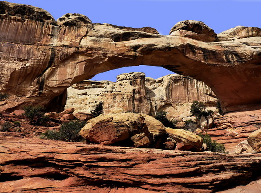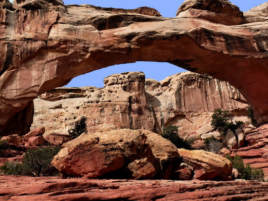Wir sind nicht wirklich begeistert vom Capitol Reef und somit geht es ein kurzes Stück weiter zum Hickman Bridge Trail. Der Trail ist ca. 2,6km lang. Anfangs gehts durchaus ein wenig steil bergauf und später eben auf Felslandschaft mit kleinen Klettereinlagen. Aber echt easy.