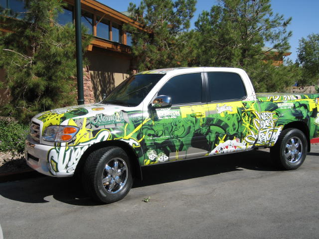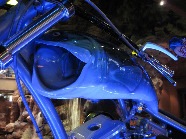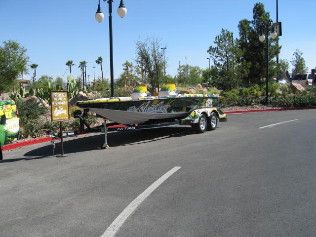 Während der Fahrt und unserer Hotel-Suche-Unterhaltung blättere ich im What’s up (Veranstaltungs- und Coupon-Magazin für Vegas). Mein Blick fällt auf ein OCC-Bike, das in der Silverton Lodge ausgestellt ist. Zur Erklärung: die Firma OCC baut Motorräder nach Kundenbestellung und das TV filmt das als wahre Reality-Show fürs Fernsehen mit. Die Sendung läuft unter dem Namen “American Chopper” immer sonntags auf RTL2 und Patrick liebt sie. Wie auf Kommando taucht am linken Straßenrand das Silverton Hotel-Casino mitsamt Outdoor-Shop auf. Hier müssen wir natürlich kurz anhalten, um das Bike zu besichtigen. Im Valet-Parking-Bereich sehen wir zuerst einen Pick-up mitsamt Speed-Boat, der von der MTV-Sendung “Pimp my ride” aufgemotzt wurde.