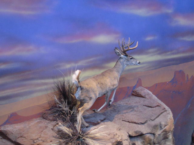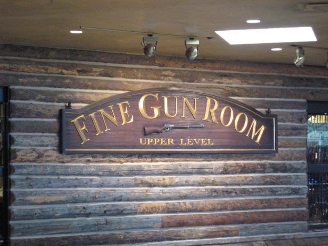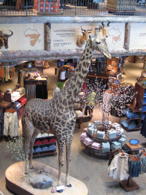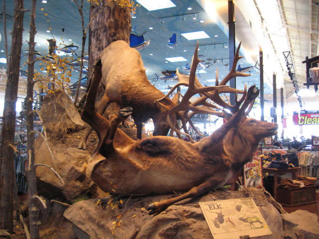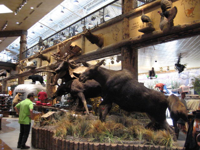 Dann schleppe ich den Schatz in den Outdoor-Laden. Hier bekommen wir den Mund kaum noch zu. Über Golf-Outfits, Angler-Ausrüstung, alles für die Jagd und natürlich Schusswaffen (furchtbar) gibt’s auch eine Bogenschieß-Anlage, auf der man die neu erstandenen Flitzebogen ausprobieren kann. Natürlich auch einen Schießstand, an dem man seine teuer bezahlte Schrotflinte testen kann. Auf 2 Etagen findet man alles für alle Dinge, die man draußen so anstellen kann. Sogar Motorboote in allen Variationen. “Geschmückt” ist das Ganze mit ausgestopften Tieren und auch wenn ich so was eigentlich nicht mag, muß ich gestehen, dass es echt gut gemacht ist. Die Tiere sind in Kampf- Situationen aufgebaut und sehen aus, als wenn sie sich jeden Moment bewegen müssten. Wirklich nicht zu fassen.