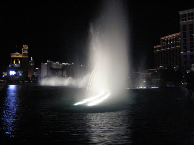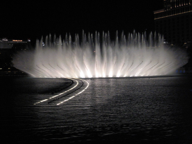 Ich will endlich die Bellagio-Fontänen sehen. Als wir ankommen ist es kurz nach 22 Uhr und vom Auto aus habe ich gerade noch den Schluß gesehen. Ich behaupte, sie würden alle 30 Minuten zu sehen sein (hatte ich gelesen) und so warten wir…. Allerdings dauert es noch eine geschlagene Stunde, bis es wieder los geht. Es ist schon erstaunlich, wie beeindruckend ein Springbrunnen mit ein bißchen Licht und Musik wirkt. Weil es unsere letzten paar Tage sind, passt “Time to say Goodbye” natürlich besonders gut und weil ich bereits bei der Merci-Reklame im Fernsehen heulen muß, kommen mir fast die Tränen.