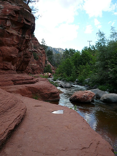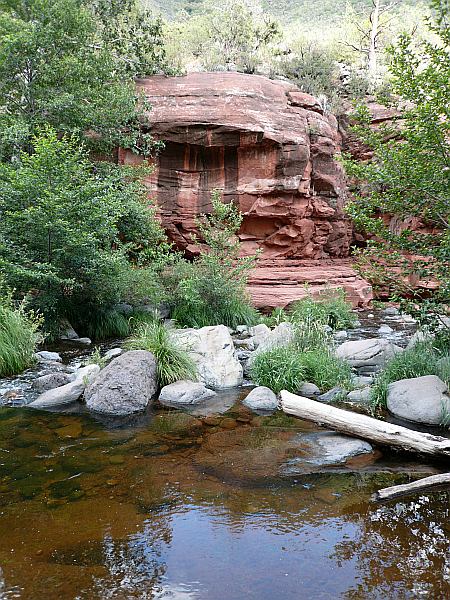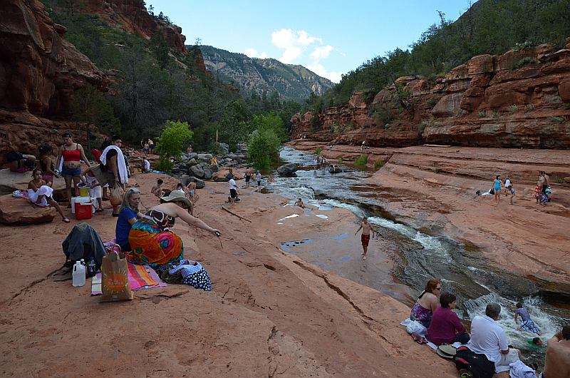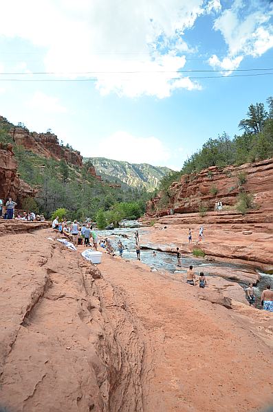 Auf dem Weg zurück nach Sedona schaltete sich plötzlich eine Wetterwetterwarnung in unser Radioprogramm. Nach einem ersten Überraschungsmoment schafften wir tatsächlich eine gemeinschaftliche Übersetzung, die uns jedoch etwas beunruhigte: Es gab eine Tornadowarnung für eine Gegend in der Nähe unseres Tagesziels Flagstaff. Also blieben wir kurzentschlossen noch etwas länger in „Sedona City“. Zunächst gönnten wir uns ein Mittagessen in einem China-Restaurant, anschließend bummelten wir durch die interessanten Geschäfte Sedonas. Viele Esoteriker mit Gewinnorientierung prägen diese Stadt, die nicht umsonst auch Beverly Hills on the Rocks genannt wird. Einige der Angebote aus dem Bereich der Mineralien mit Heilwirkung waren schon etwas sehr skurril. Später traten wir die Fahrt zum Slide Rock State Park an; auch diesen Park hatten wir noch gut in Erinnerung. Es gibt dort eine natürliche Wasserrutsche und im Verlaufe des Oak Creek einige Schwimmpools. Wider Erwarten war es gar nicht so voll, wir verweilten ein wenig und bestaunten die mutigen Besucher, die trotz des recht kalten Wassers die Wasserrutsche nutzten oder ziemlich mutig vom Rand in die Pools sprangen.